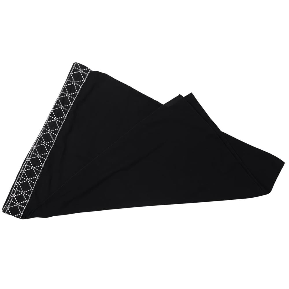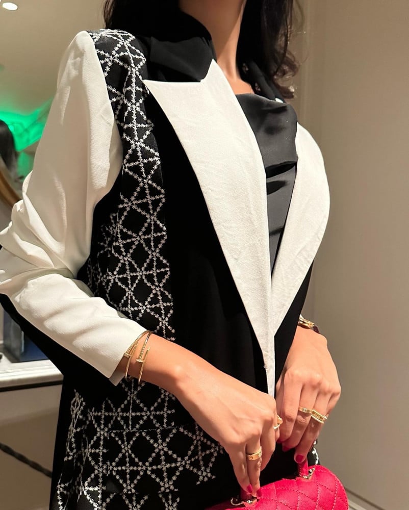 التفاصيـل : قماش كريب اسود كوري ولنن مطرز وكريب ابيض، قصة بالطوا كلوش، جيوب شكل فقط، طرحة اسود طرف.