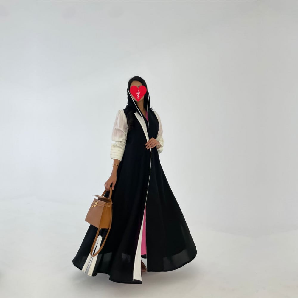 التفاصيـل : عباية كتان كوري اسود وكتان سكري مخطط، قصة كلوش، طرحة طرف سكري مخطط.