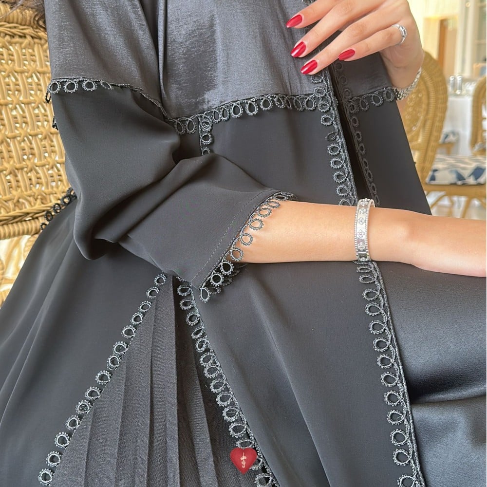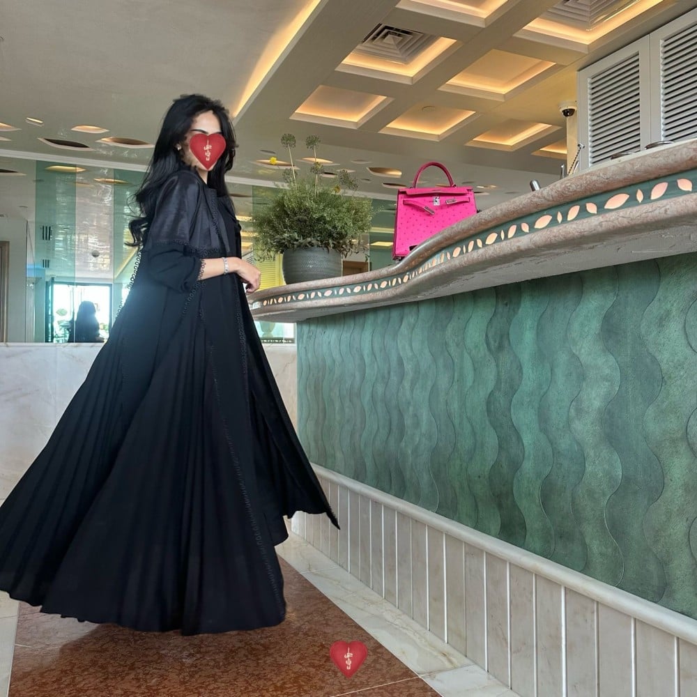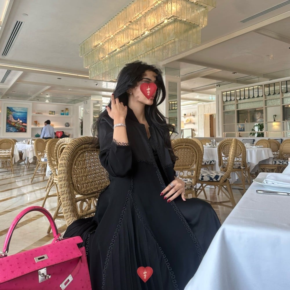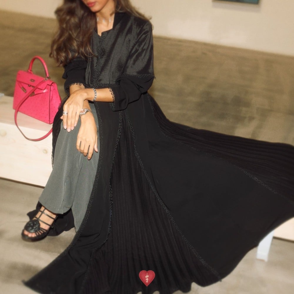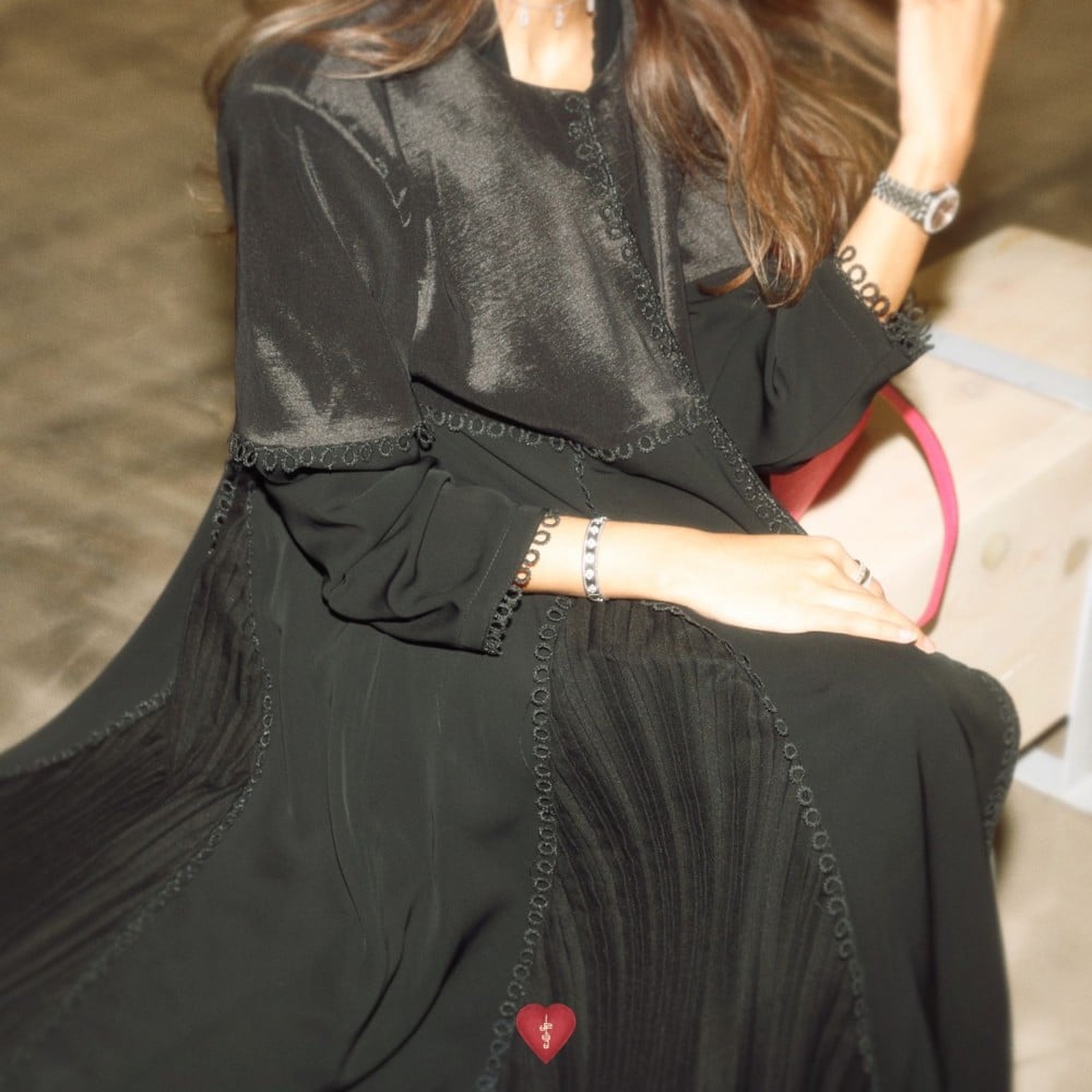 التفاصيـل : عباية قماش أسود كريب وتفتة ايطالي وكتان كسرات متوفر ثلاث الوان ( اسود “#٣٣٨ - زيتي "#٣٤٤" - كحلي "#٣٤٣" )،، قصة دبل كلوش ، طرحة مع كلفه.