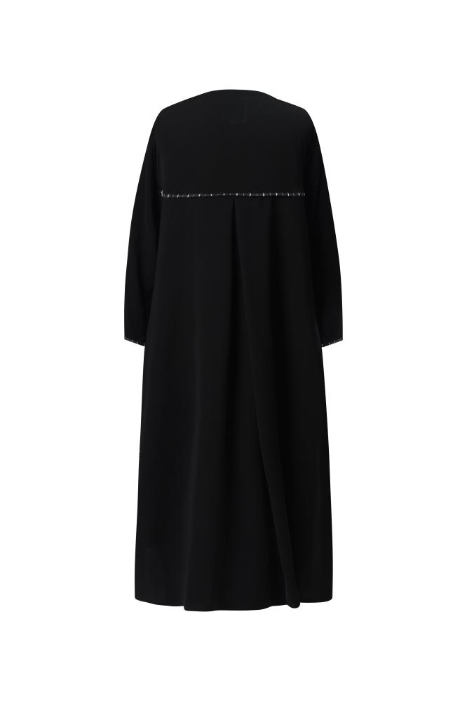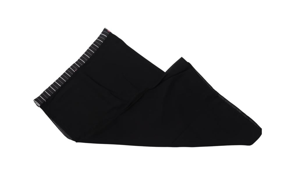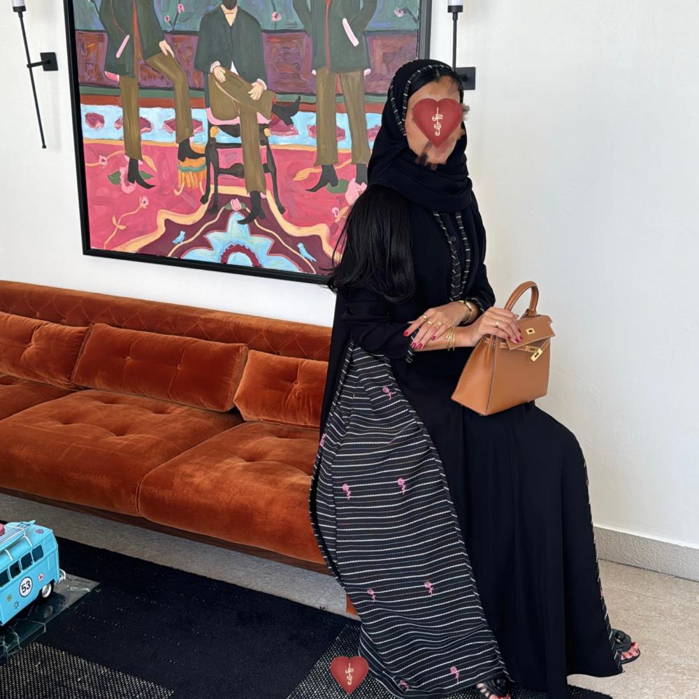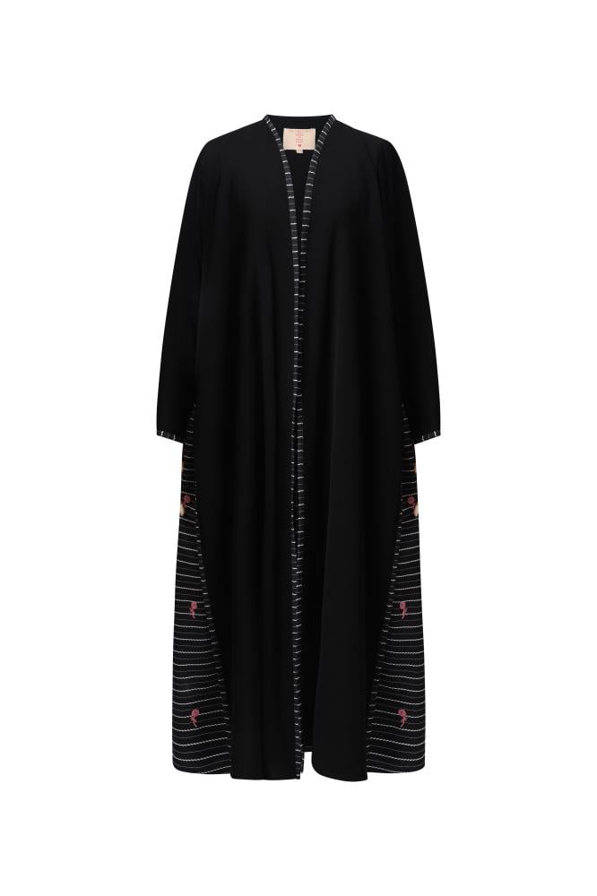 التفاصيل: عباية من قطعتين مخيطة مع بعض ، القطعه السفلية قماش كتان اسود مخطط تطريز وردي ، والقطعه العلويه قماش كريب اسود ملكي ،قصة كلوش ،طرحة اسود كلفة طرف .