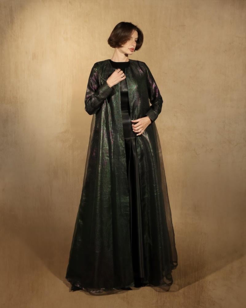 التفاصيل: عباية قماش اورقنزا اسود لمعه ملونـة ، بطانة شيفون اسود اندنوسي، قصة دبل كلوش، طرحة نص نفس قماش العباية.