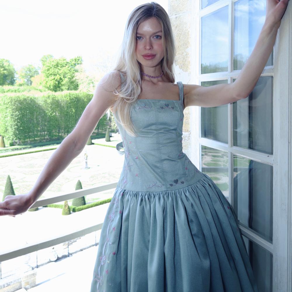 يزدان الفستان بتطريزات فيونكات وقلوب على الحواف، مستوحاة من حديقة صيفية مزهرة مليئة بالحياة.