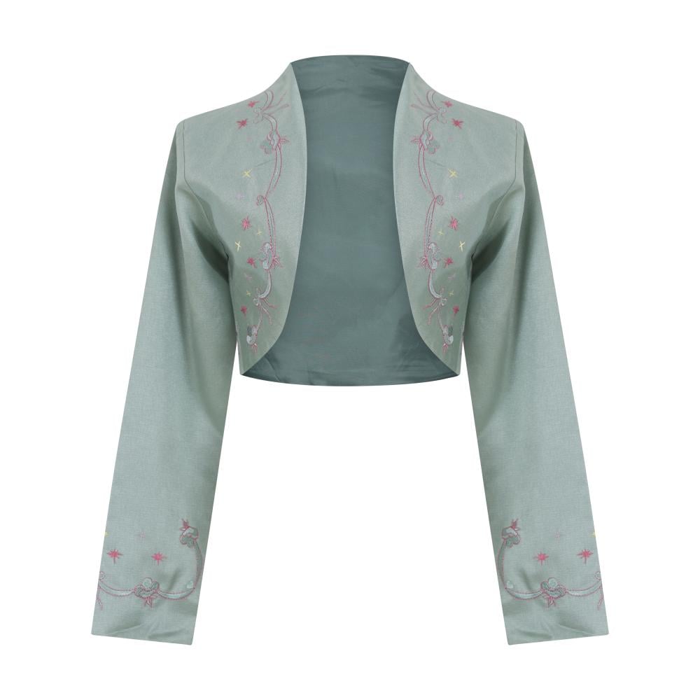 The look comes complete with a matching cropped jacket, featuring embroidered trims, and a bold oversized bow at the back—a perfect harmony of softness and structure.