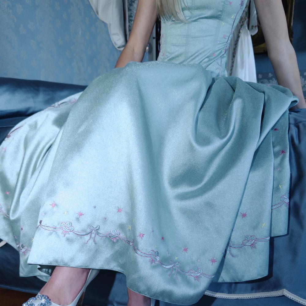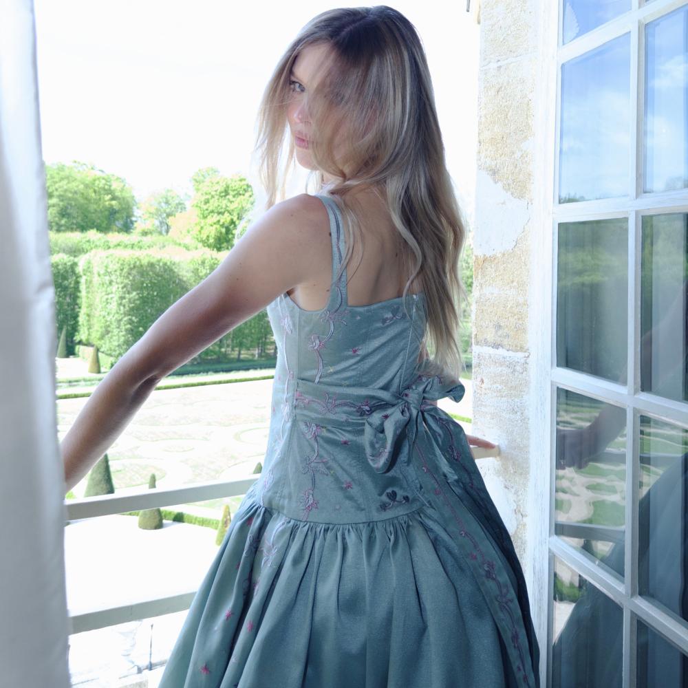 Crafted from luxurious Russian taffeta in a fresh mint green, the dress features our signature low waist cut and a voluminous, flowing skirt that adds graceful movement.