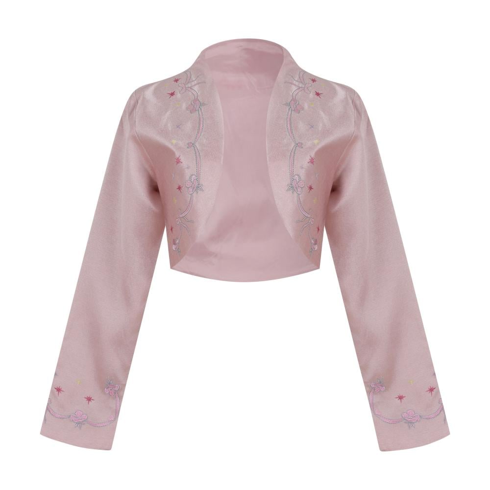 The look comes complete with a matching cropped jacket, featuring embroidered trims, and a bold oversized bow at the back—a perfect harmony of softness and structure.