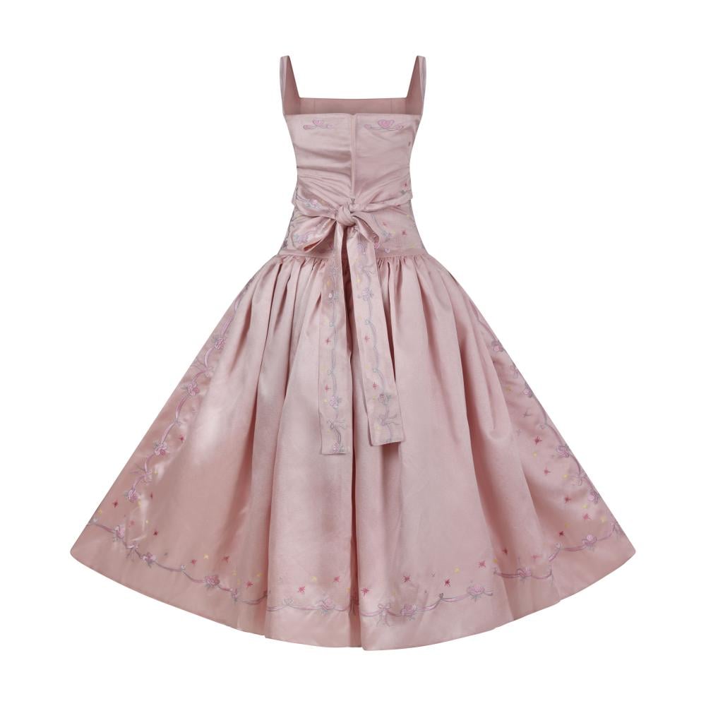 Crafted from luxurious Russian taffeta in a soft blush pink, the dress features our signature low waist cut and a voluminous, flowing skirt that adds graceful movement.