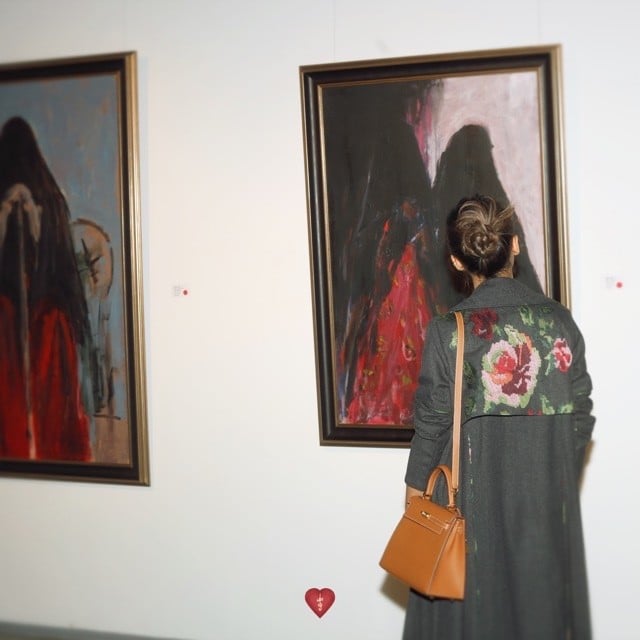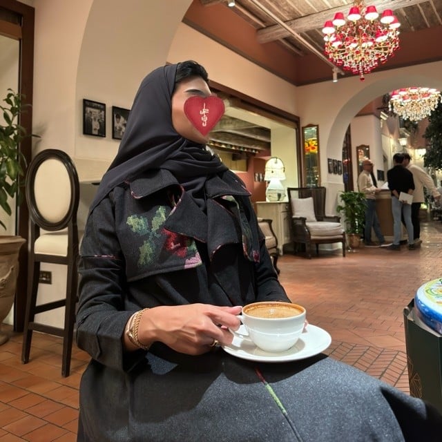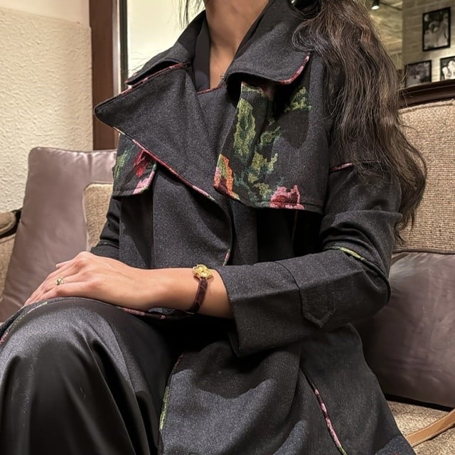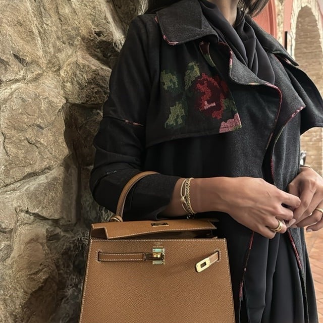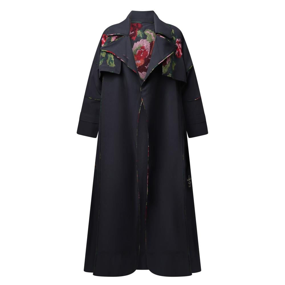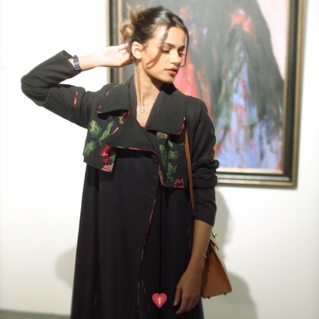 التفاصيـل : عباية قماش جوخ رمادي غامق مطرز، قصة ترنش كوت كلوش. طرحة رمادي سادة.