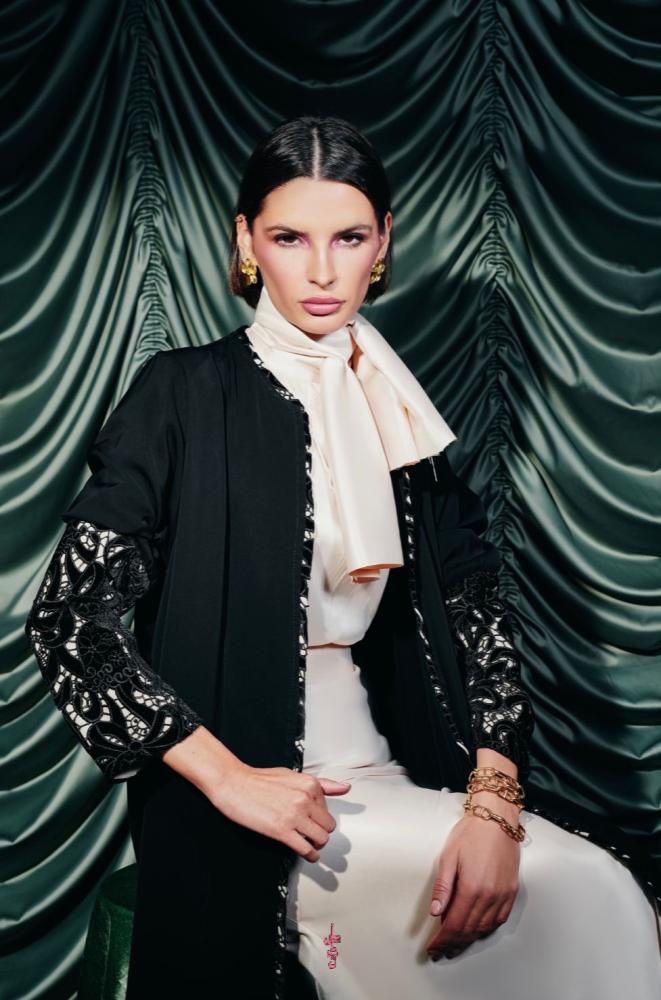 التفاصيل: عباية قماش كريب ناعم اسود، الكم وطرف العبايه من قماش مخمل اسود ، مشجر بطانه قماش كريب ناعم بيج , قصه كلوش , طرحه اسود طرف كلفه قماش مخمل مشجر اسود بطانه كريب ناعم بيج.