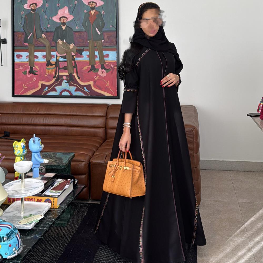 التفاصيل : عباية قماش كتان اسود ، تطريز ملون ، قصة دبل كلوش ، طرحة اسود طرف كلفة تطريز.
