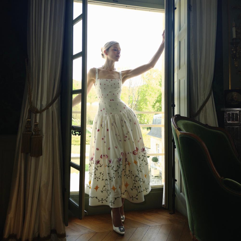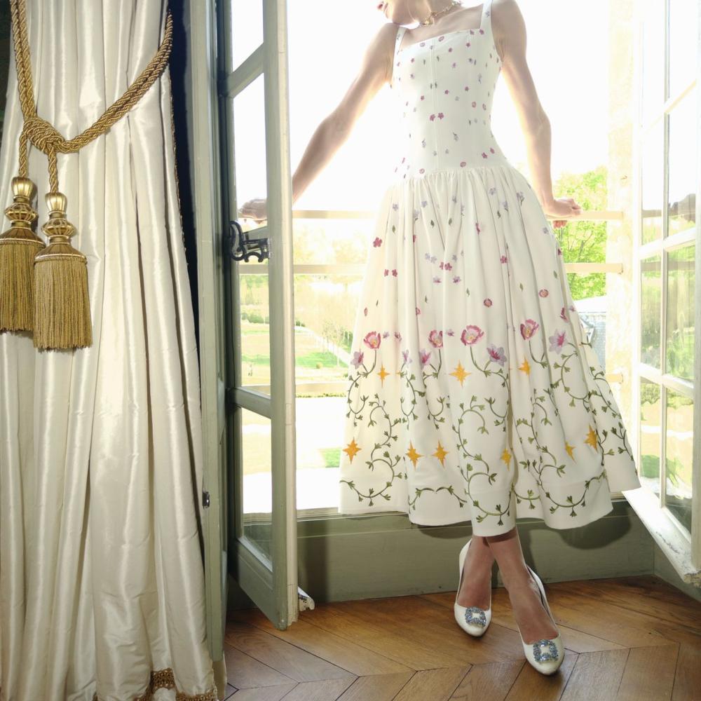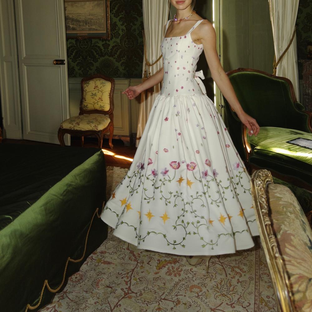 A simple belt at the waist enhances the shape, giving the piece a soft structure without losing its dreamlike charm.