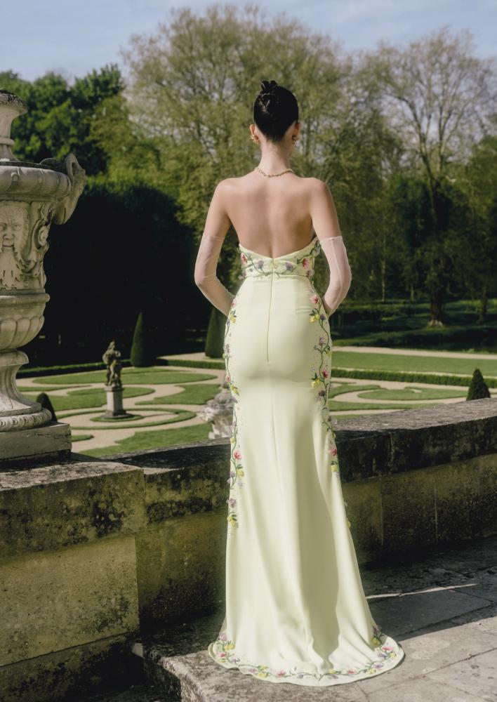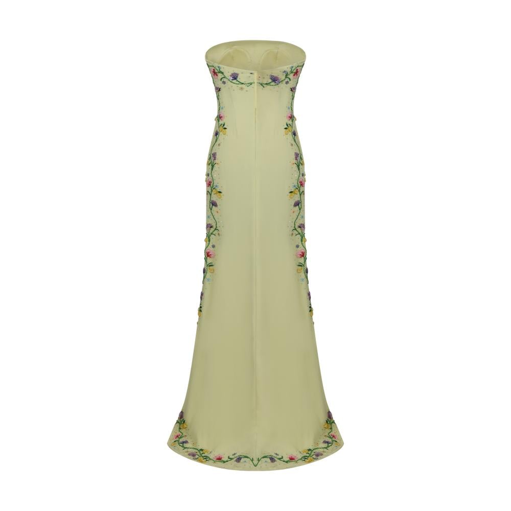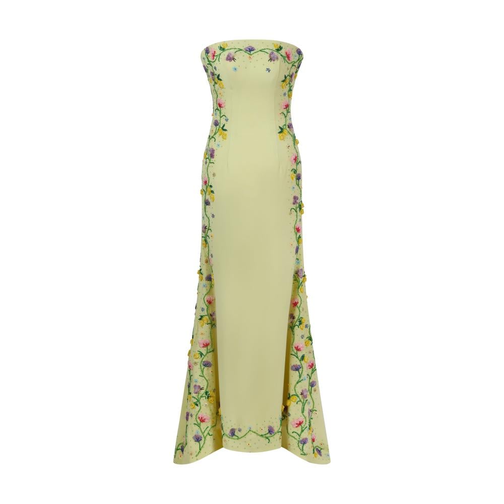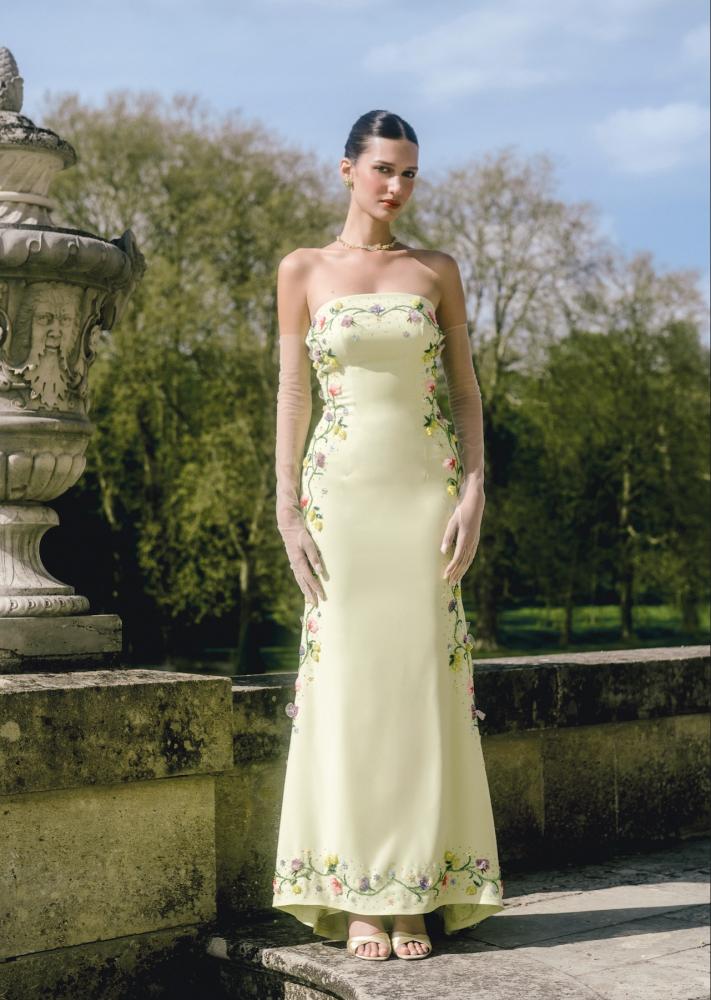 Crafted from lemon-toned Spanish crepe, this strapless, figure-hugging silhouette embraces femininity with understated strength.