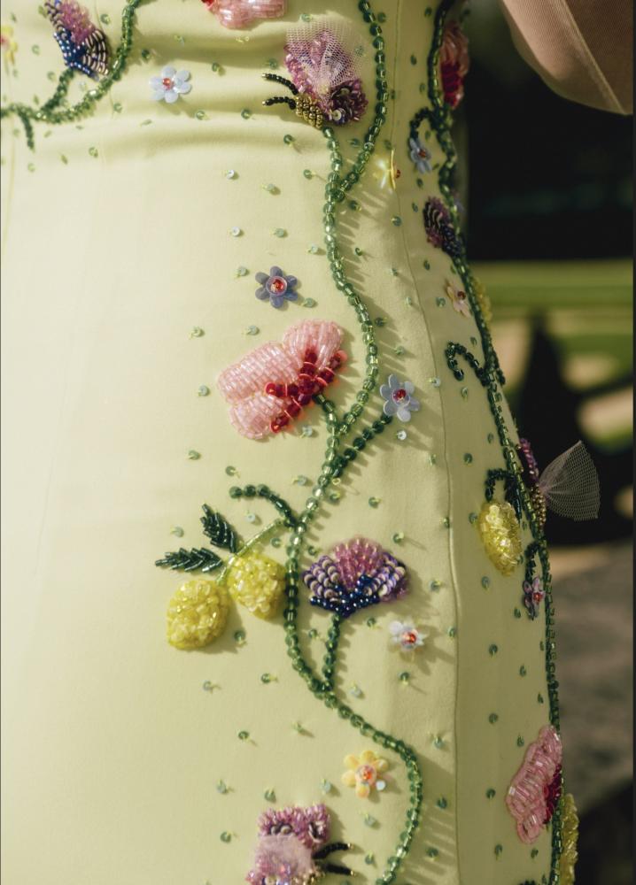 Embroidered by hand, beaded lemons and butterflies trace across the fabric—delicate and dynamic, echoing the movement of a summer garden in full bloom.